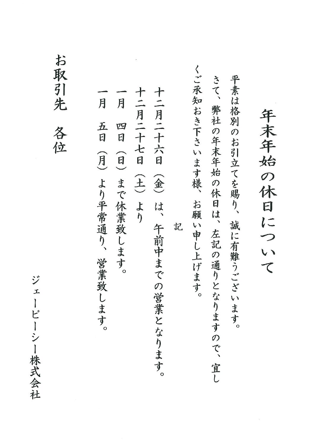 弊社の年末年始の休業日は